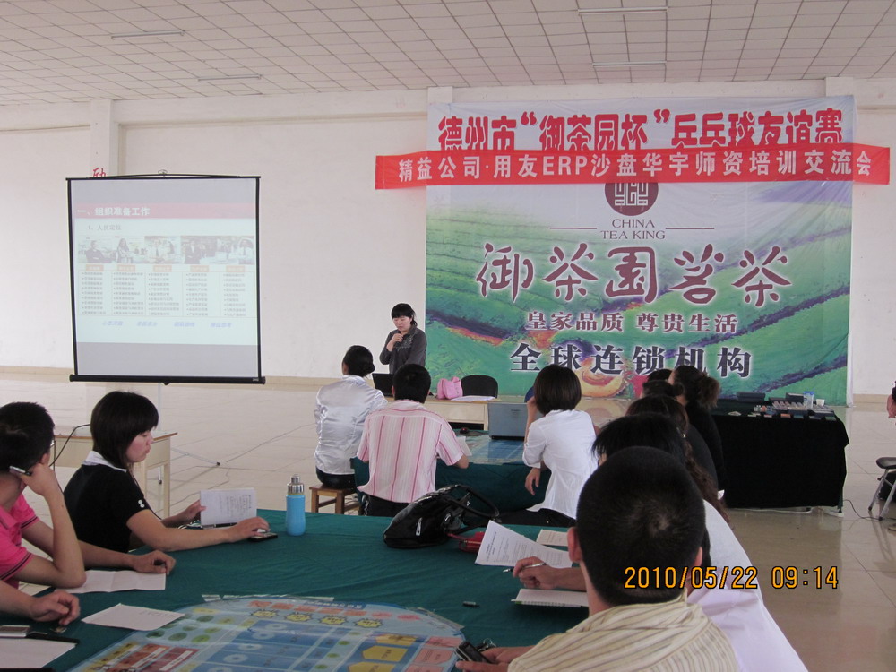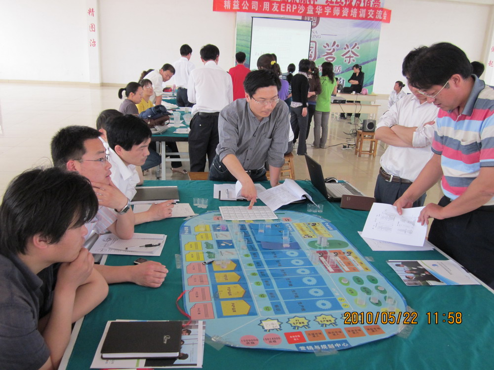 为加深教师对企业经营管理的进一步认识,经济管理系于2010年5月22日在华宇学院老员工俱乐部承办了德州精益公司用友ERP沙盘培训,公司经济管理系主任张开涛、教学主任孔建华、我系30余名教师以及德州学院、德州职业技术学院、德州科技职业学院10多名教师代表共同参加了此次培训。该培训以物理沙盘为主,由用友ERP公司的培训人员为各位老师讲解沙盘大赛比赛规则。